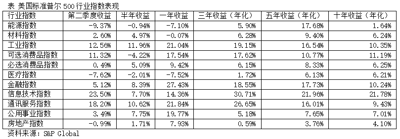 在极其复杂的经济与政治背景下,美国股票市场总体表现尚可,但行业指数走势差异较大。与以往一样,从长期看,信息技术和通讯服务指数表现最好,金融指数和工业指数也相当出色。从短期看,今年上半年,表现最好的行业指数依次为工业指数、通讯服务指数、金融指数、公用事业指数和信息技术指数。