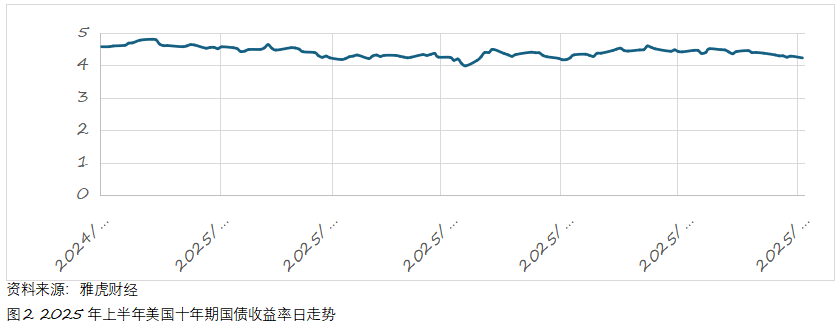 美国债券市场却经历了严峻考验。美国联邦政府总负债不断扩大,新通过的税收法案(大而美法案)提高了政府的债务上限,债券市场特别是国债发行市场,受到投资者从未有过的冷遇。十年期国债利率变化让市场和美国政府的神经高度紧张。如图2,十年期国债收益率总体呈下降趋势,但过程却比较惊心。今年年初,由于通胀压力,十年期国债收益率升至4.80%左右(收盘价),随着通胀压力缓解,收益率随之下降,但5月三十年期国债拍卖利率向上突破5%,叠加国际地缘政治因素,十年期国债收益率升至4.596%(5月21日)。美国政府总负债已超过37万亿美元,扩张性财政政策必然增加赤字,主权债务风险已亮起红灯。长期高利率正危害美国经济增长。特朗普总统一直在向美联储施压,美联储却依然维持短期利率不变,市场只能寄希望于明年5月新任联储主席,同时也把今年减息预期推至9月份。