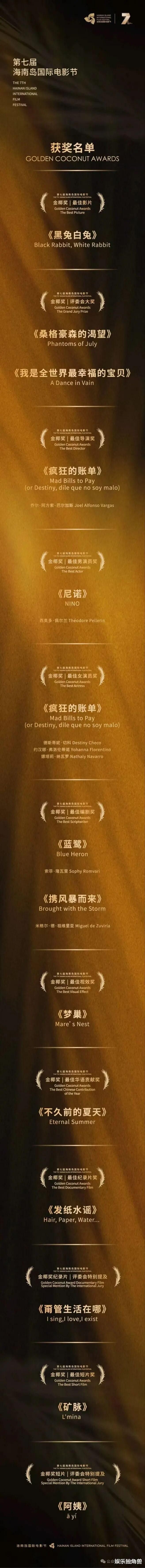 当日,《黑兔白兔》获得金椰奖最佳影片,乔尔·阿方索·巴尔加斯凭借《疯狂的账单》斩获金椰奖最佳导演,西奥多·佩尔兰凭借影片《尼诺》获得金椰奖最佳男演员,《疯狂的账单》德斯蒂妮·切科、约汉娜·弗洛伦蒂诺、娜塔莉·纳瓦罗共享金椰奖最佳女演员,影片《梦巢》摘得金椰奖最佳视效,《发纸水谣》摘得金椰奖最佳纪录片,《矿脉》摘得金椰奖最佳短片。