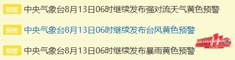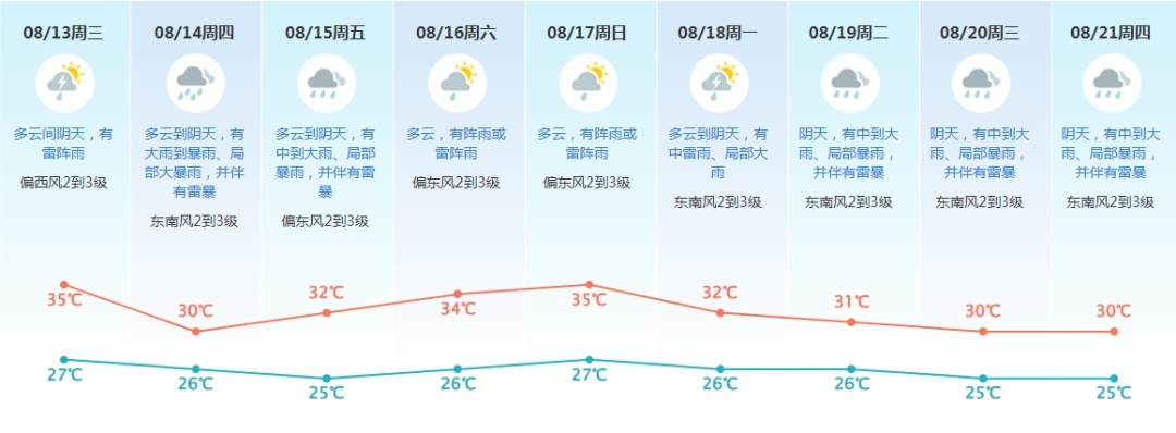 13日夜间—15日受台风环流影响,有大雨到暴雨、局部大暴雨,伴有强雷暴和8级左右短时大风,强风雨时段将出现在14日早晨到白天;