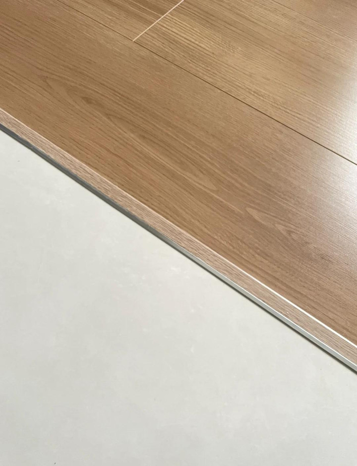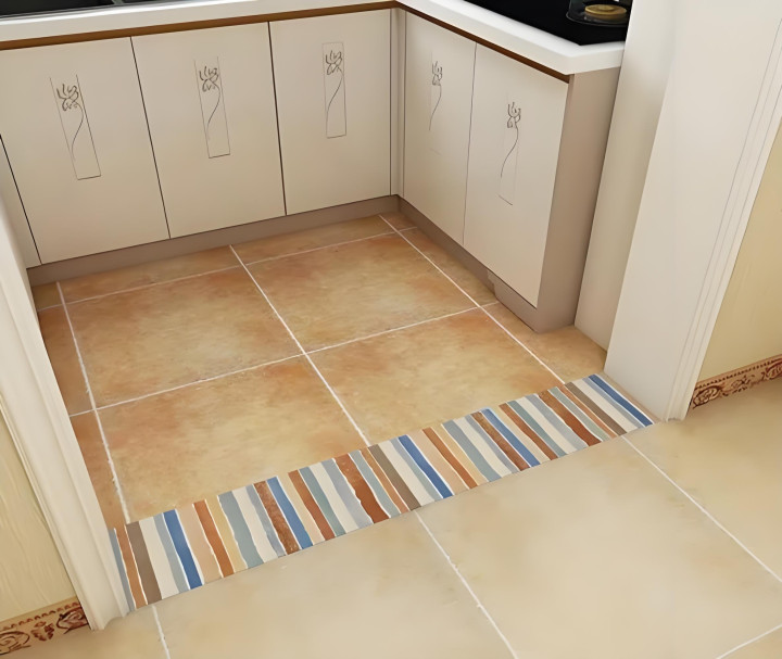 厨房门口接到客厅,用薄薄的不锈钢条或铜条嵌在缝里。厚度只有2到3毫米,几乎看不见。效果是现代感,线条干净利落。选5毫米以内的细条,颜色和地面接近。金色别用太宽的,宽了显土。适用:木地板接瓷砖、同色系不同材料过渡。