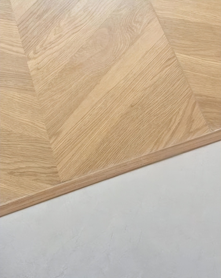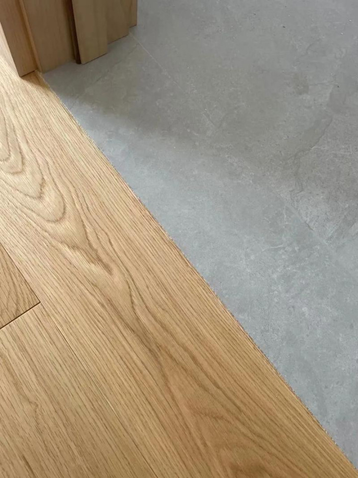 工艺很干净,两种材料直接对裁紧贴,中间留一条3到5毫米的缝,打上和地面同色的环氧彩砂。但是这条缝受热胀冷缩挤压,时间长了容易裂开。适用:对美观要求高、居住环境温湿度稳定、且不介意以后可能需要补胶的情况。