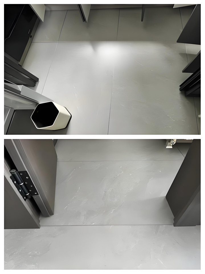 找和地面一模一样的大砖,裁成过门石的尺寸贴在门口。效果是从远处看像通铺,但稍微低头就发现颜色和花纹根本不一样。优点是费用低、师傅省事。花纹对不齐的时候远看明显是两块砖拼的。适用:预算紧张又有强迫症的,认真考虑后再决定。